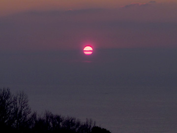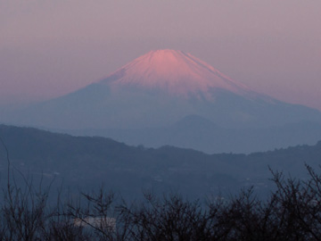 この日は水平線近くに雲があり、日の出が少し遅くなりましたが、その作用で富士山は紅く染まりました。 |