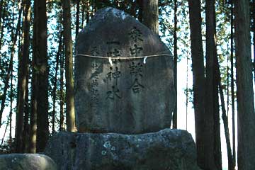 | 記念碑 集中談合 一味神水 室町時代の村の人々は、大切な問題がおこると神社に集まり、談合(話し合い)を重ね、意見が一致するとみなで社の水をくんで飲みかわし団結を誓った。 室町時代の古文書に出てくる言葉でいまの言葉でいえば、民主主義と一致協力というところでしょう。 町史編さん委員長 永原慶撰 記念碑 高サ四、五米 重量三〇頓 天神社改築記念として昭和六十一年十月二十五日 阿多野区氏子建立奉納 |