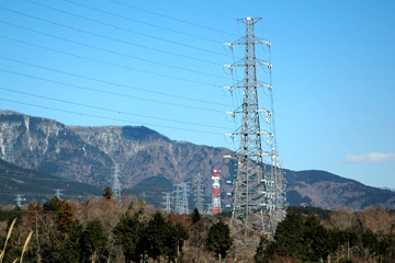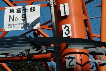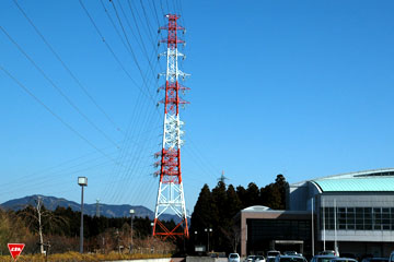 足柄峠から遠望したとき、林立する送電鉄塔のうち一つだけ紅白に塗り分けられた鉄塔が目立ちました。 どの辺りになるのか見当をつけ、現地を訪ねてみました。 場所は小山町総合文化会館の北側に位置します。東富士線の他、三菱マテリアル線、電子金属小山線が分岐しているため、高さを確保する必要があったのだと考えられます。一般に高さ60m以上の構造物は航空法により赤白7段に塗り分ける定めがあります。他の鉄塔は60m以下であるため、一つだけ目立つ存在になっています。