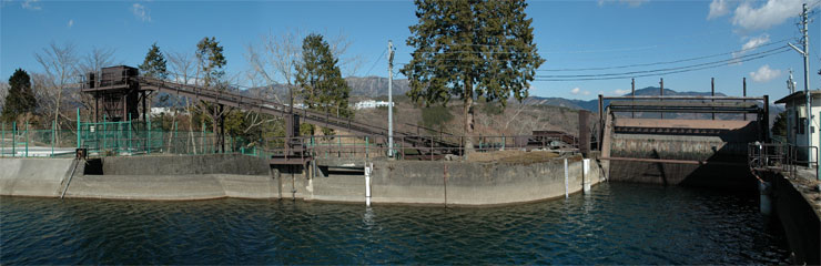 | 用水路終点 写真は画角が120度ぐらいあるので歪んでいますが、左が上流になります。右の水門から発電所へ送水されます。 |