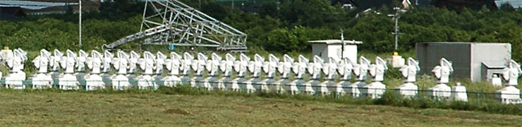 | ▲電波へリオグラフ 直径80cmの電波望遠鏡84台がT字型に並んでいます。これにより直径500m相当の解像度が得られるそうです。 |