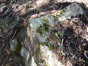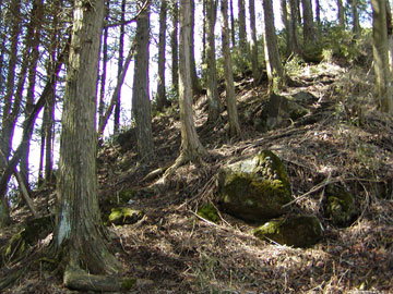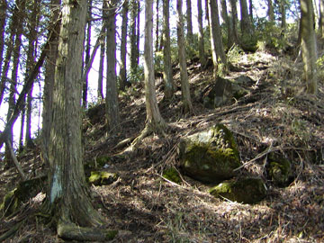 阿弥陀尾砦があったとされる丹土尾(につちお)砦跡へ分岐するピークから東へ数百メートルのところに、急勾配の斜面があります。ここに、人工的に加工されたと思われる石が転がっていました。単なる岩場なのかもしれませんが、いずれにしても、山伏平方面から防衛する場所として、この急勾配は最適ではなかったでしょうか。 | ||||||||