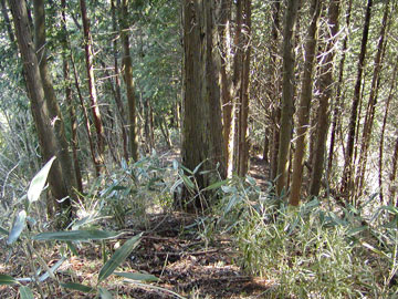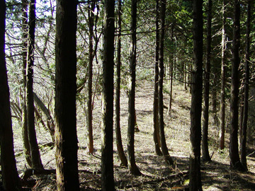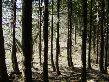| (02)立体写真で見る阿弥陀尾砦址(立体写真の見方はこちら) 現在はヒノキに覆われていて地形も把握しにくい状態でした。 | |||||||||