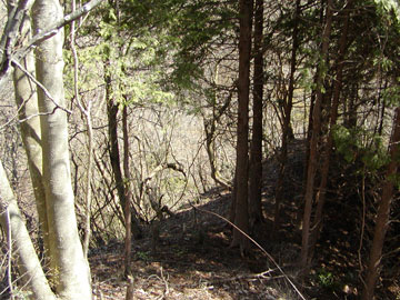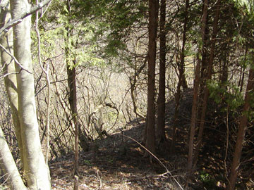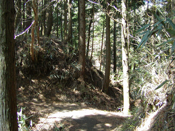 | (06)山伏平の堀切 現在の登山道は蛇行していますが、戦国時代は尾根上の通る道がここで一度途切れる仕組みになっていました。 |