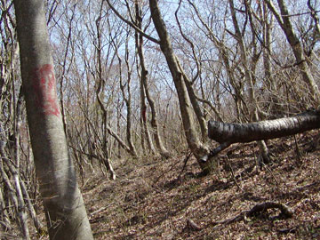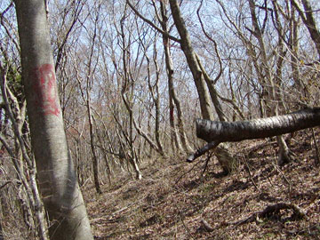 | (10)鳥手山(とでやま)へ 押立山の尾根道は注意深く進まないと、腕ヶ岳へ下ってしまいます。樹木にペイントされた目印をたよりに北斜面を下ります。 | |||||||||