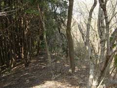 押立山から大窪までの道は多少不明瞭な状態になっていました。ただ、樹木にスプレーでペイントされた目印が所々にあるので、間違えることはないと思います。 大窪を過ぎると再び登りになります。目指すは1/25000地形図にも掲載されている「鳥手山(とでやま)」ですが、道は山頂には伸びず、西側を迂回しています。谷峨駅へは恐らくこの道を進んでいけばたどり着けるのだと思いますが、今回は少し引き返し鳥手山山頂を訪れてみました。 大窪から鳥手山山頂へは南斜面の杉・檜の森の杣道を登ります。かなり荒れているので、これまでのペースでは進めなくなります。 鳥手山(とでやま)は砦山とも解することができますが、風土記稿にはカタカナでトテヤマという記載があります。 |