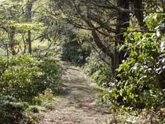 | (19)近野山から登山道に合流-振り返って撮影(立体写真) 左方向から下ってきました。登山道は右へ伸びています。 金比羅社のある場所から東尾根へ下ろうと、道らしき踏跡を進むと南側へカーブしていました。このままでは洒水の滝のある沢筋に下ってしまうと思い、途中で引き返すことにしました。他に杣道があるかもしれないと、山頂周辺を探したのですが見つからず、あきらめて東尾根を下ることにしました。結論として南へカーブした道は間もなく、南斜面から東へ伸びる杣道と合流し、沢へ下ることはありませんでした。 |