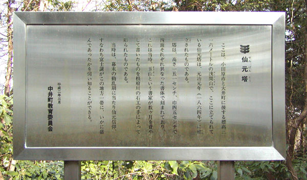 ここは、小田原市と大井町に接する標高三一六メートルの浅間山(せんげんやま)で、ここに立てられている仙元塔は、元治元年(一八六四年)に建立されたものである。 塔は、高さ一五一センチ、巾四五センチで四面それぞれ異なった書体で刻まれており、これは当時、玉山(ぎょくざん)という書家が数ヶ月を費やして書いたものを根府川の石工の手によって彫られたものである。 当時は、幕末の動乱期に当たり仙元信仰、すなわち富士講がこの地方一帯に、いかに盛んであったかを伺い知ることができる。