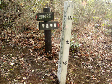 10年ぐらい前に一度訪れたことがありました。 そのときの記憶で浅間山に仙元塔の説明板があったはずでしたが、山頂には見当たりませんでした。結論から言うと、3つある電波塔の一番北にある場所の裏手であるため、解りづらかったのです。 これは富士山を祀る信仰である富士講の記念碑です。 仙元は浅間が文字化けしたものだと思われ、発音を同じくしてより良い文字を当てることはよくあるようです。浅間(センゲン)も元はアサマが正しかったということを本で読んだことがあります。富士山や火山の神様に由来するといった内容だったか... 冨士講の影響でついた山名であるからして、一般的に言って、浅間山と名のつく山からは富士山の眺めが良いといえます。