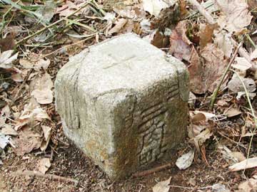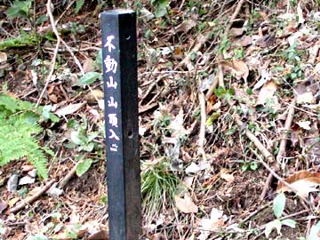 浅間山方面から進むと、尾根筋を東側(左側)にずれて南下することになります。地形図では尾根の中心として描かれていて、正確ではありません。 山頂入口の案内表示された杭は杉の木の影で見落としやすいので、注意が必要です。 山頂までは30秒もあれば到着します。山頂は針葉樹が植林されていて、残念ながら見晴らしは利きません。 北西1kmにある浅間山の石碑(仙元塔)に不動明王・・・と刻印されていたので、この名称が南東に変位した可能性は考えられないでしょうか。