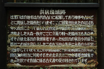 大森・後北条の両時期にわたって、足柄山地北辺の交通をおさえる城として重視された尾根城。天正九年(1581)後北条氏から浜居場城に城の管理および警備に関する取締要綱「はまいは掟」が伝えられている。