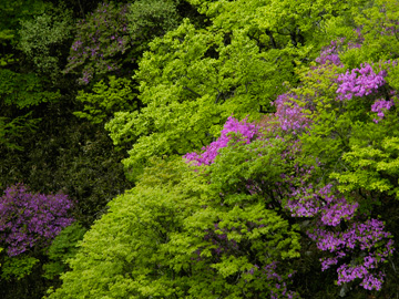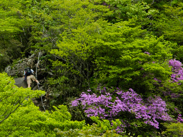 写真にしてしまうと、どうしても迫力や臨場感がなくなってしまうことは解っているのですが、ついシャッターを切ってしまいます。こんな山奥にこんなにも美しい風景があるとは、実際目の当たりにしても信じ難いものがあります。下界でいうツツジとは背の高さも風貌も異なり威厳が感じられます。しかもこれらは誰かが植えたものではなく勝手に生えているところが素晴らしい...。 | |