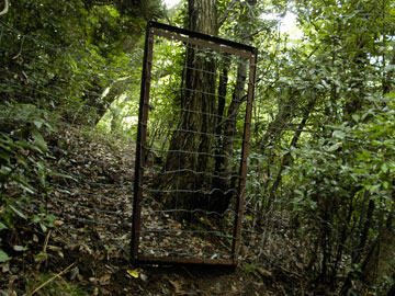 12 防護柵の横断用扉 柵伝いに尾根を下って行くと、尾根を横断する道が現れました。 |