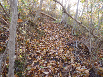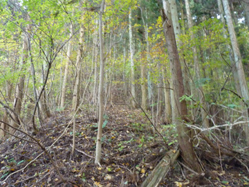 踏跡は消失し、それらしきものは動物の歩いたケモノ道と思われます。幸いなことに下草がさほど茂っておらず、ルートファインディングが容易なことでした。 |