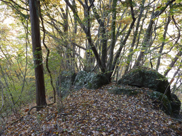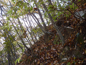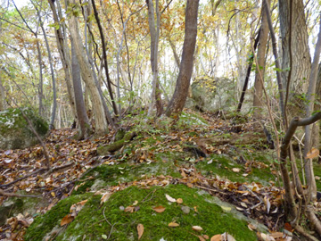 杉・桧林なら人の手が入っているため、作業道があるのですが、あたりは広葉樹の森です。巨石が現れはじめ、その上に落ち葉が積もり、滑りやすい状態が続きます。これがどこまで続くのだろうかと不安な気分になったりします。 |