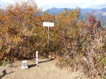 ヤブが開け、明るい尾根に出てみると、そこはまさしく菊花山の山頂、三角点のある小広場に直登でした。写真中央の茂みから出て来たことになります。 |