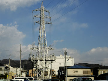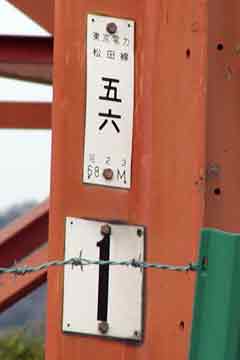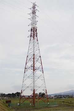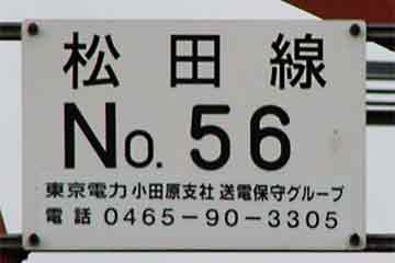 送電線松田線の出発点は調べていませんが、終点は小田急線新松田駅南側にある変電所です。No.56の位置は小田急線酒匂川橋梁の南部、サイクリングコース脇にあります。酒匂川を超えるロングスパンのためでしょうか、ひときわ高く聳え、航空法により赤白に塗られています。他の鉄塔は灰色をしているので足柄平野北部のランドマークにもなります。 | ![]() |