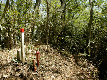 1/25000地形図には道が記されていますが、現場は濃いヤブでとても進めそうにありません。木々が生い茂っていることから、かなり前に廃道になったのでしょう。 |