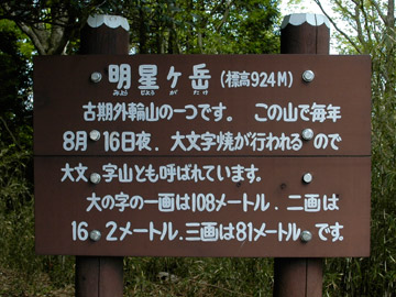 古期外輪山の一つです。この山で毎年8月16日夜、大文字焼が行われるので大文字山とも呼ばれています。大の字の一画は108メートル、二画は162メートル、三画は81メートルです。 (現地案内板より転載)