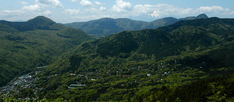 左下の早川沿いに宮城野集落が形成されています。中央の台地は明神平別荘地。