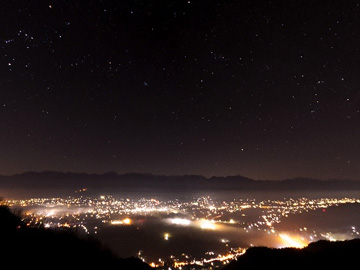 日中は目立つことのなかった千国街道(国道147号)が夜間は南北を結ぶ光の筋となって現れます。また平行して走る道路にも近年、大型量販店が開業したようで、非常に明るい照明を放っています。夜景を撮影したのは11月と、登山のシーズンは過ぎていましたが、燕山荘や北穂高小屋の灯りが見えます。