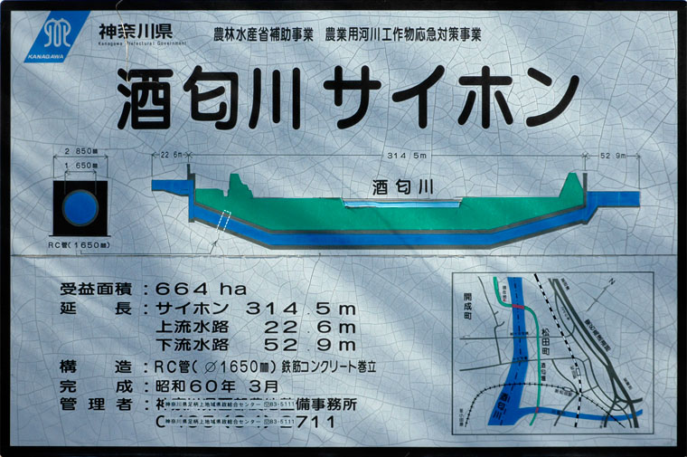 酒匂川左岸の不足しがちの農業用水を補うため、右岸の用水を酒匂川の下をサイホン式に通した構造物です。 左岸(開成町側)の農業用水は現在、東電の文命用水から取水ています。私見ですが、右岸側に敢えて通すのは、渇水時でも水力発電用水は優先されるため、水の確保が確かであるためと考えられます。