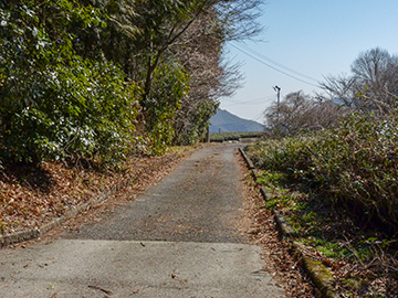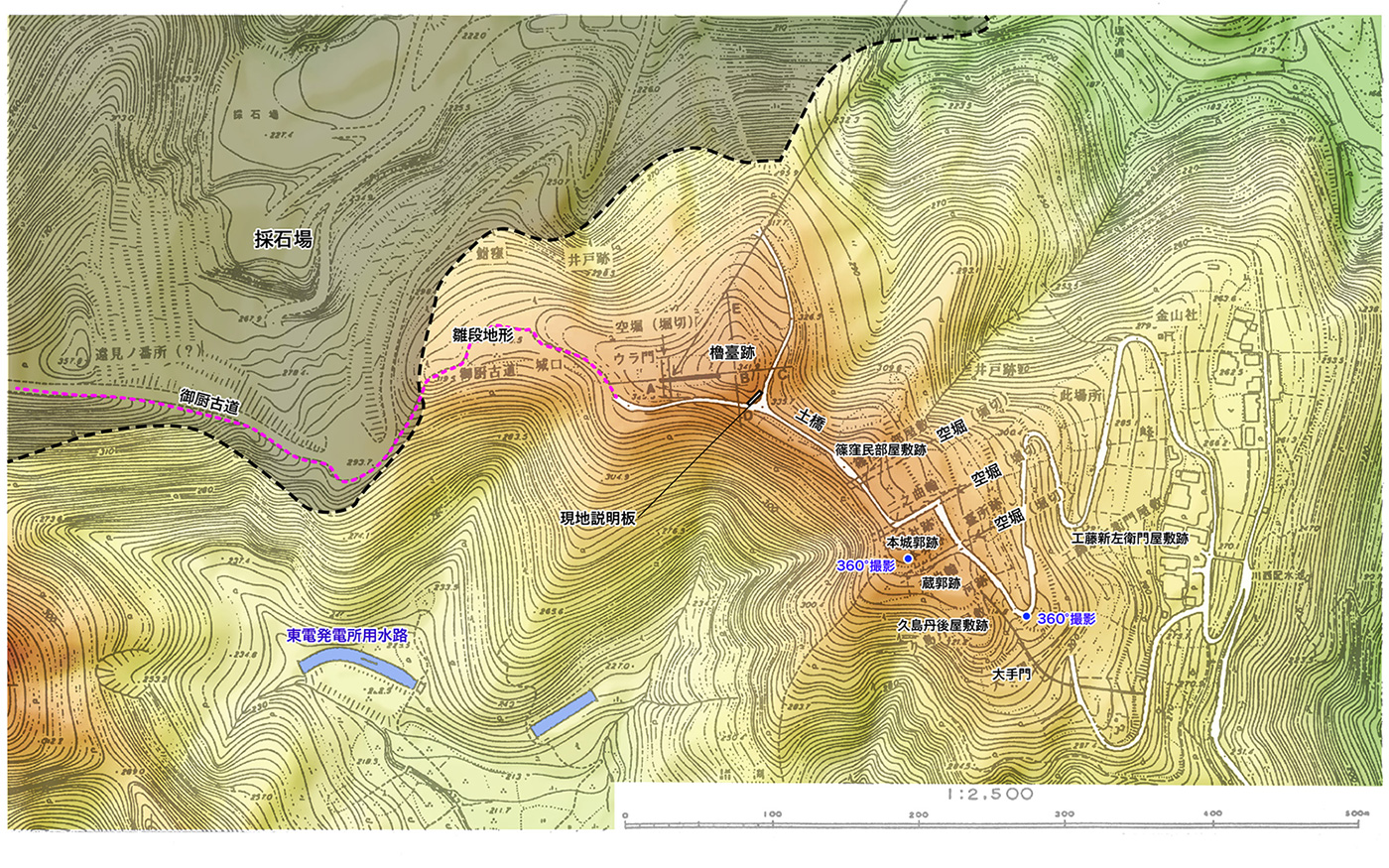 地図と照合すると2番目の空堀の上に築かれた道路といえます。 |