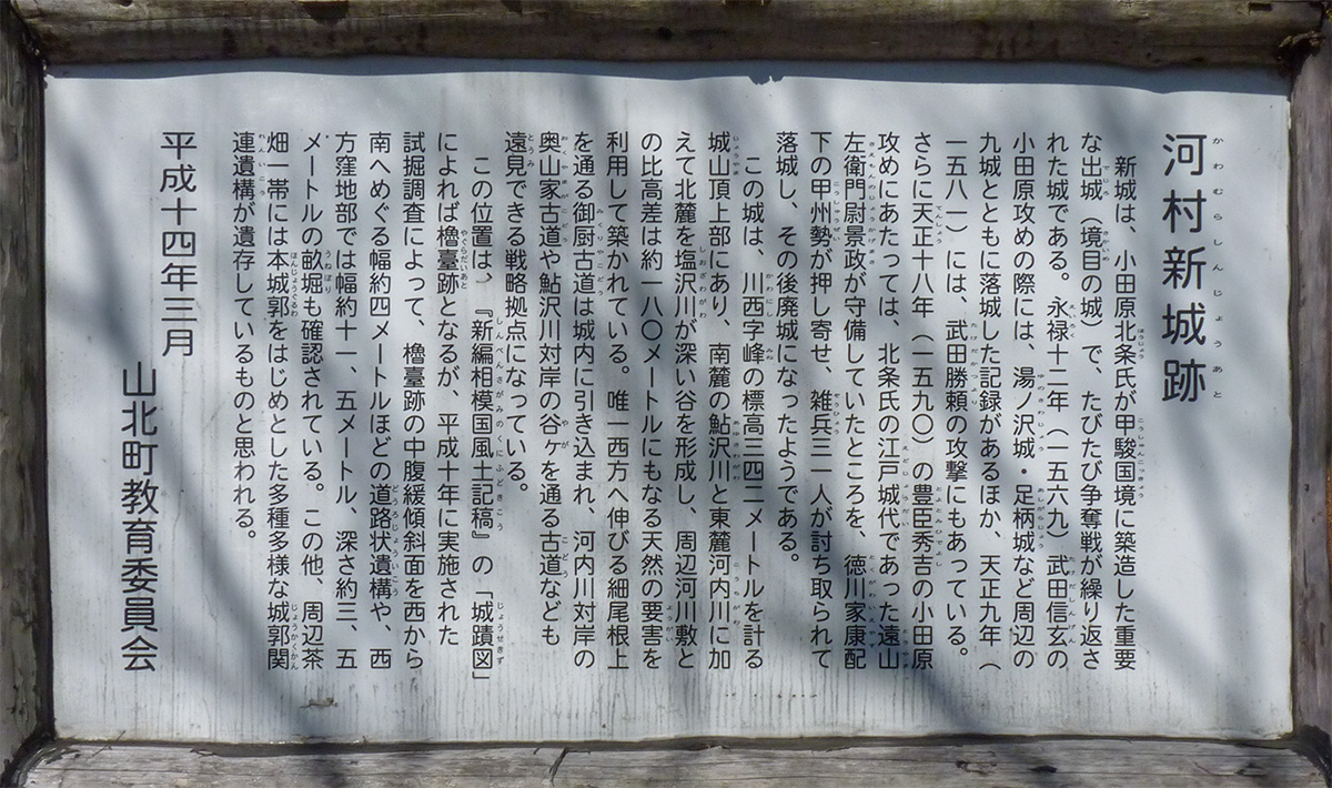 河村新城跡 新城は、小田原北条氏が甲駿国境に築造した重要な出城(境目の城)で、たびたび争奪戦が繰り返された城である。永禄十二年(1569)武田信玄の小田原攻めの際には、湯ノ沢城・足柄城など周辺の九城とともに落城した記録があるほか、天正九年(1581)には、武田勝頼の攻撃にもあっている。さらに天正十八年(1590)の豊臣秀吉の小田原攻めにあたっては、北条氏の江戸城代であった遠山左衛門尉景政(とおやまさえもんのじょうかげまさ)が守備していたところを、徳川家康配下の甲州勢が押し寄せ、雑兵三一人が討ち取られて落城し、その後廃城になったようである。 平成十四年三月 山北町教育委員会 現地説明版より転載 |