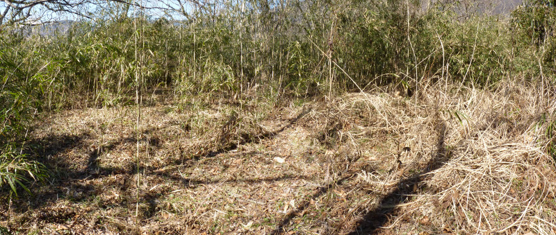 西の尾根を進み、北側の斜面を覗くと雛段状の地形がありました。当時の遺構なのか、後の時代の段々畑跡なのか... |