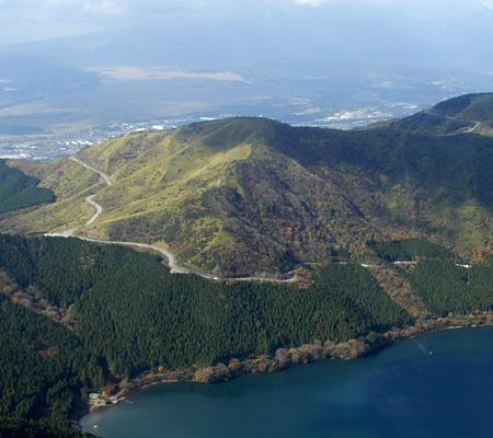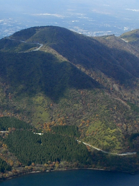 左手の鞍部が湖尻峠。向こうへ延びる道路が箱根スカイラインです。