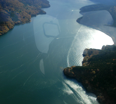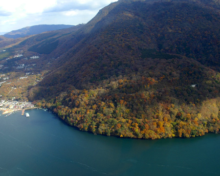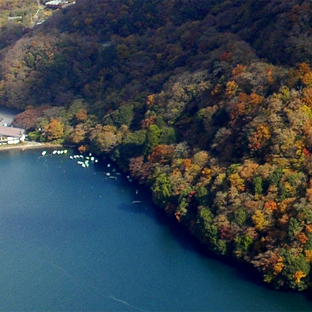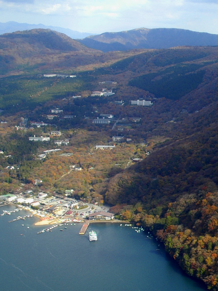 左から奥へ点々と見えるのは箱根ロープウェイ 右奥の山は明神ヶ岳