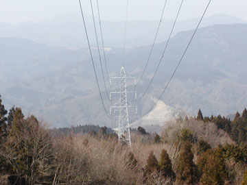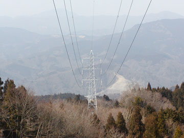 | 万葉公園から山伏平へ向かう途中に、明神線の線下を通る地点があります。南東側の展望は開けていますが、この道は尾根上にないため、北側は望めません。 少し、足柄峠側にルートを戻った地点から保守点検用の道があるので、そこを登ると間もなく尾根に出ます。 |
