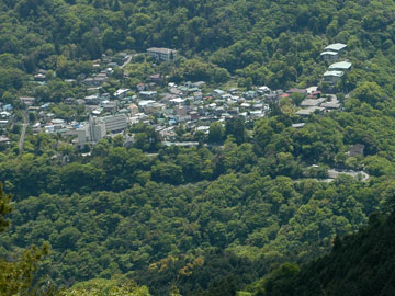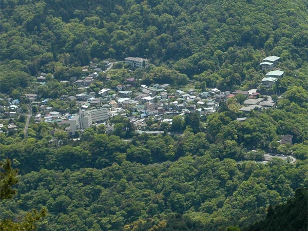箱根、大平台の街並が見えます。箱根登山鉄道大平台駅はスイッチバックのある駅。地形が複雑であることの証明でもあります。写真右下には国道1号のヘアピンカーブが見てとれます(クリックで拡大)。 |