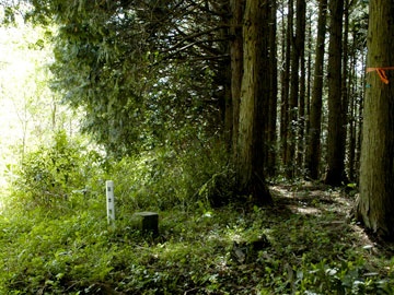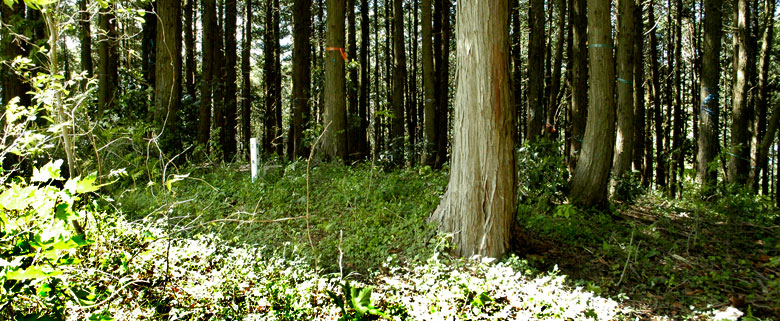 山北町史に掲載されていたため、以前から訪れてみたい場所のひとつでした。 ここ一年ぐらい都夫良野(つぶらの)周辺の集落に興味を抱き、遺跡らしき場所を踏査しています。 ハイキングコースとして定着している背後に聳える大野山ですが、ガイドマップには載っていない麓の裏道を歩くのも面白いものと実感しています。 場所は地形図で標高430.9mを示す三角点のある頂です。点の記には地蔵堂脇から道が延びているように書かれていましたが、現在はその位置には国交省の無線中継施設があり、道らしきものは消失しています。敷地脇から強引に登ろうとも思いましたが、ヤブが繁茂していて、すぐに断念しました。もう少しアプローチしやすそうな場所はないものかと地蔵堂の西の舗装された道を進むことにしました。数年前まで火葬場があったところです。その手前の西斜面は杉・桧林で間伐も行われていて中を進むことが出来ます。頂を目指して尾根まで出ると尾根の背を境に人工林と広葉樹林に別れていました。 100m程進むと三角点のある頂に着きます。
