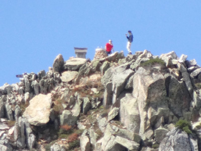 ![]() 超望遠:常念岳山頂 山名盤と祠が見えます。 |