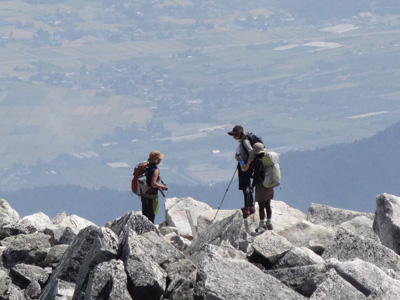 ![]() 超望遠:常念乗越の常念小屋 前常念尾根から常念小屋へトラバースするルートは廃道となっており、撮影地点からは1時間登った後、また1時間下らなければなりません。 |