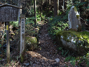 林道から歩いて2分ほどの奥にあります。 戦ヶ入林道を下って行き、人家が現れたあたりの右側に小さな祠があります。これは熊野権現を祀った社(やしろ)で、本来はここが修験道における行者道の起点です。 |