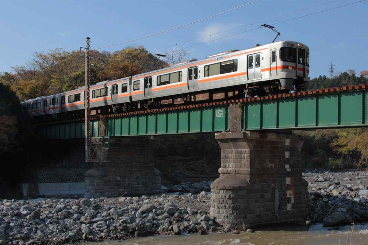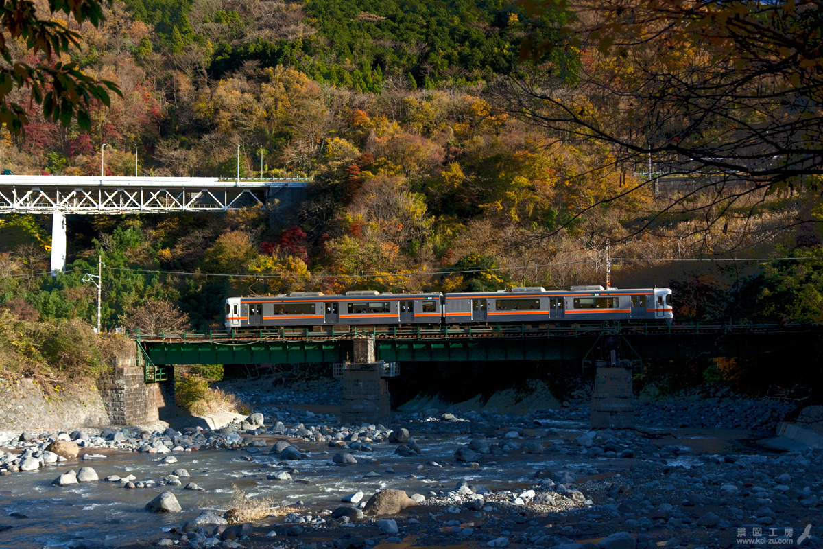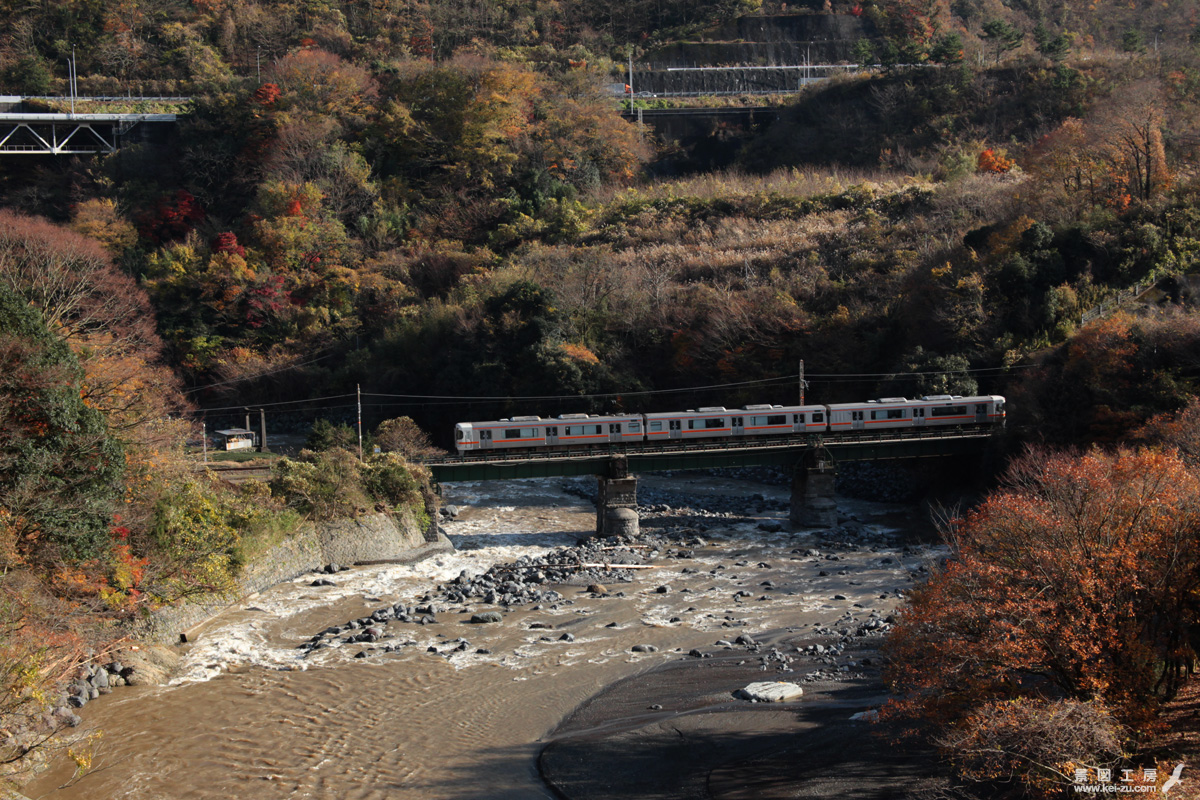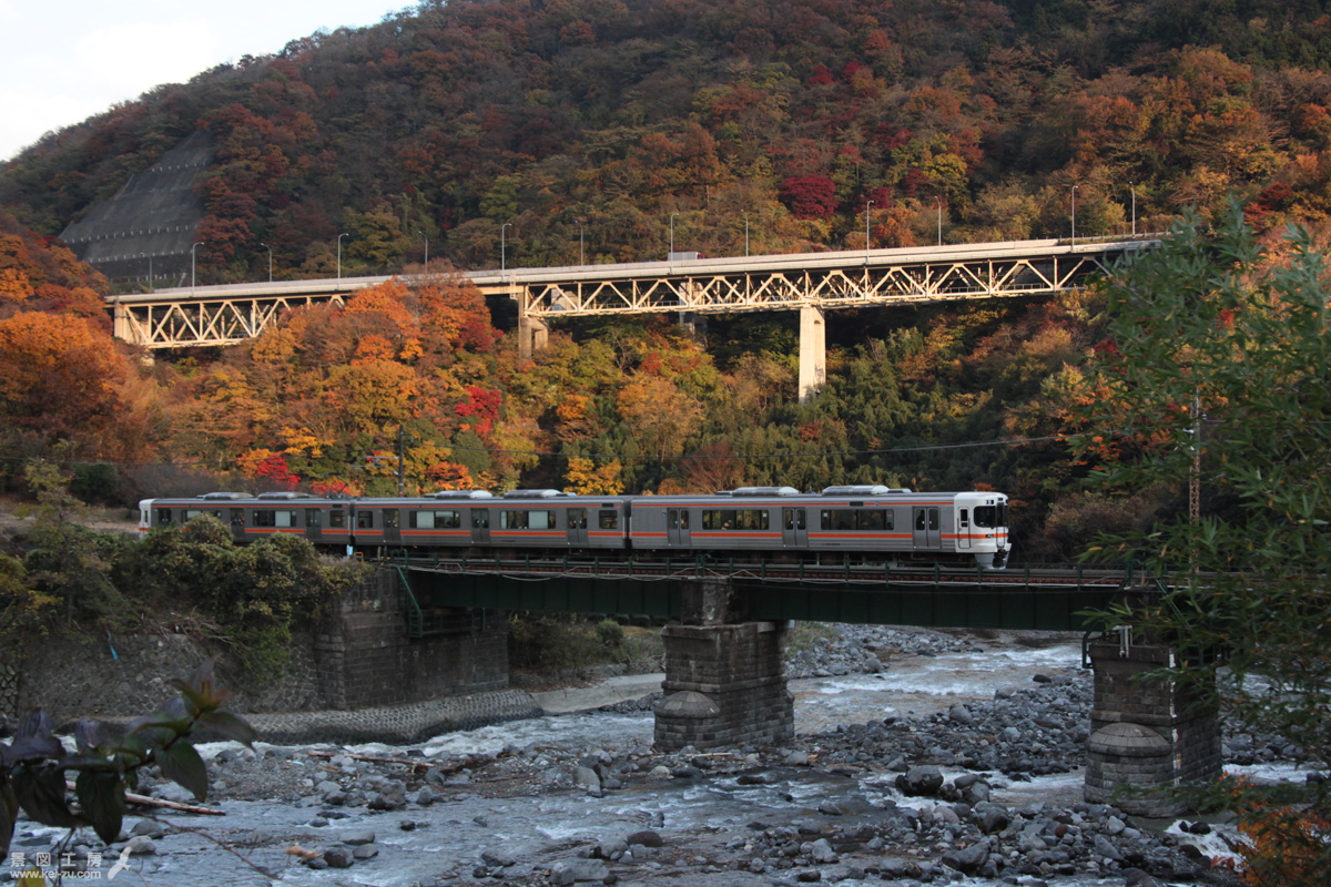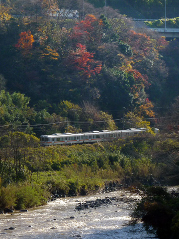透間集落の対岸を走る御殿場線は、紅葉の季節は背後の山が特に鮮やかとなり、なかなかのロケーションといえる。