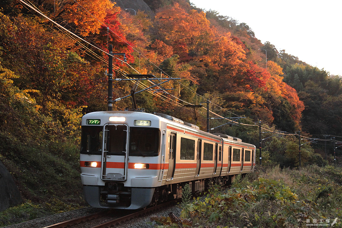 この日も午後には雲が多く沸立ち、雲が作る陰日なたに一喜一憂していた。日が沈む直前の2564G列車の通過時には、かろうじて日が差し、鮮やかな紅葉を捉えることができた。