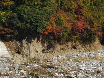 また鮎沢川の左岸の露岩には人工的に穿ったと思われる穴をいくつも見つけた。水平方向に並んでいるため、かつては木製の樋が用水路として架けられていたものと推測できる。