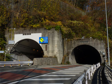 南側(写真右)のトンネルは後の時代に施工されたようで、手前の道路も川側の半分は橋桁構造である。