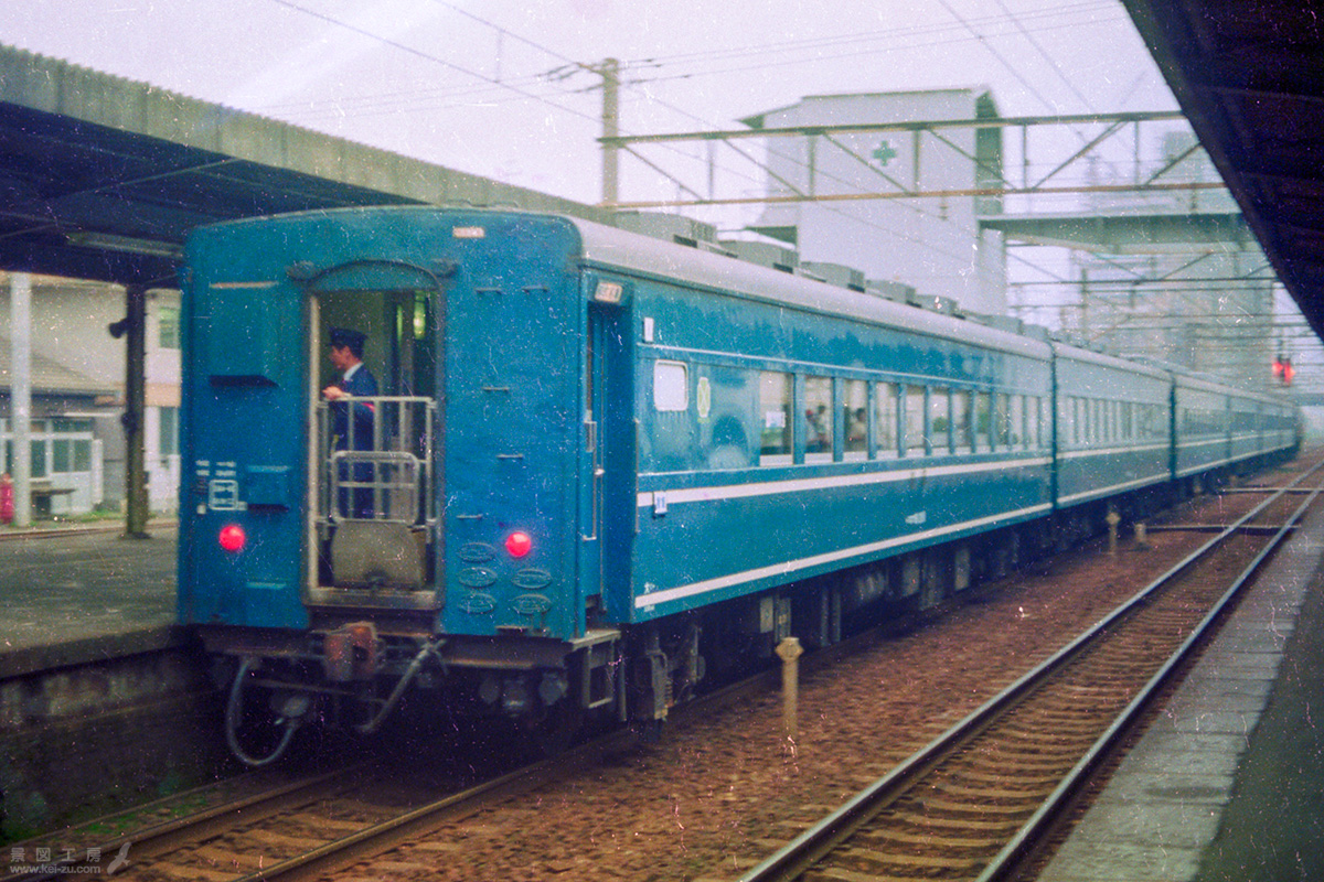 いわゆるお座敷列車という和式客車で、臨時の団体列車で運行されていた。 グリーン車マークが記すとおり形式に「ロ」が表記されている。 車端に台枠が見えている構造も興味深い。