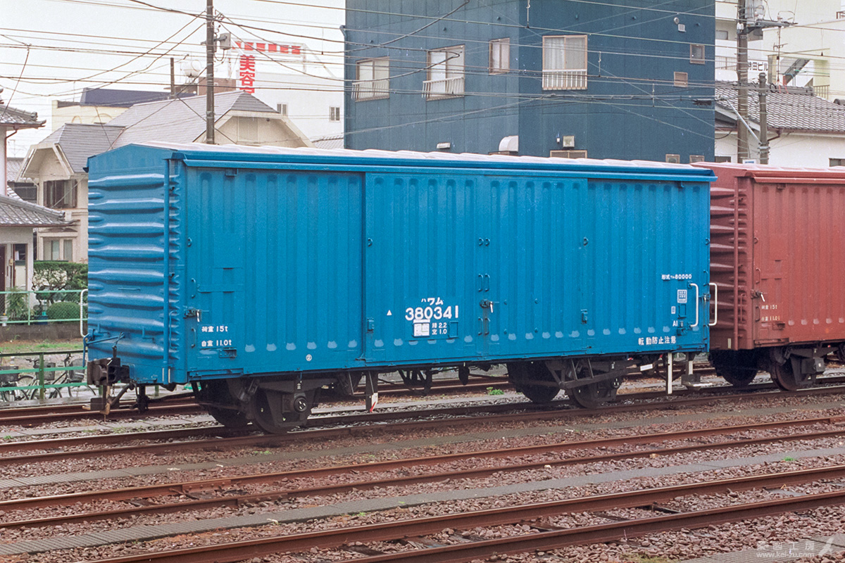 時折青いワムが混成していたので、記録した一枚である。 軸受けがベアリング機構のコロ軸受けに更新された形式で、車体は青に塗装された。