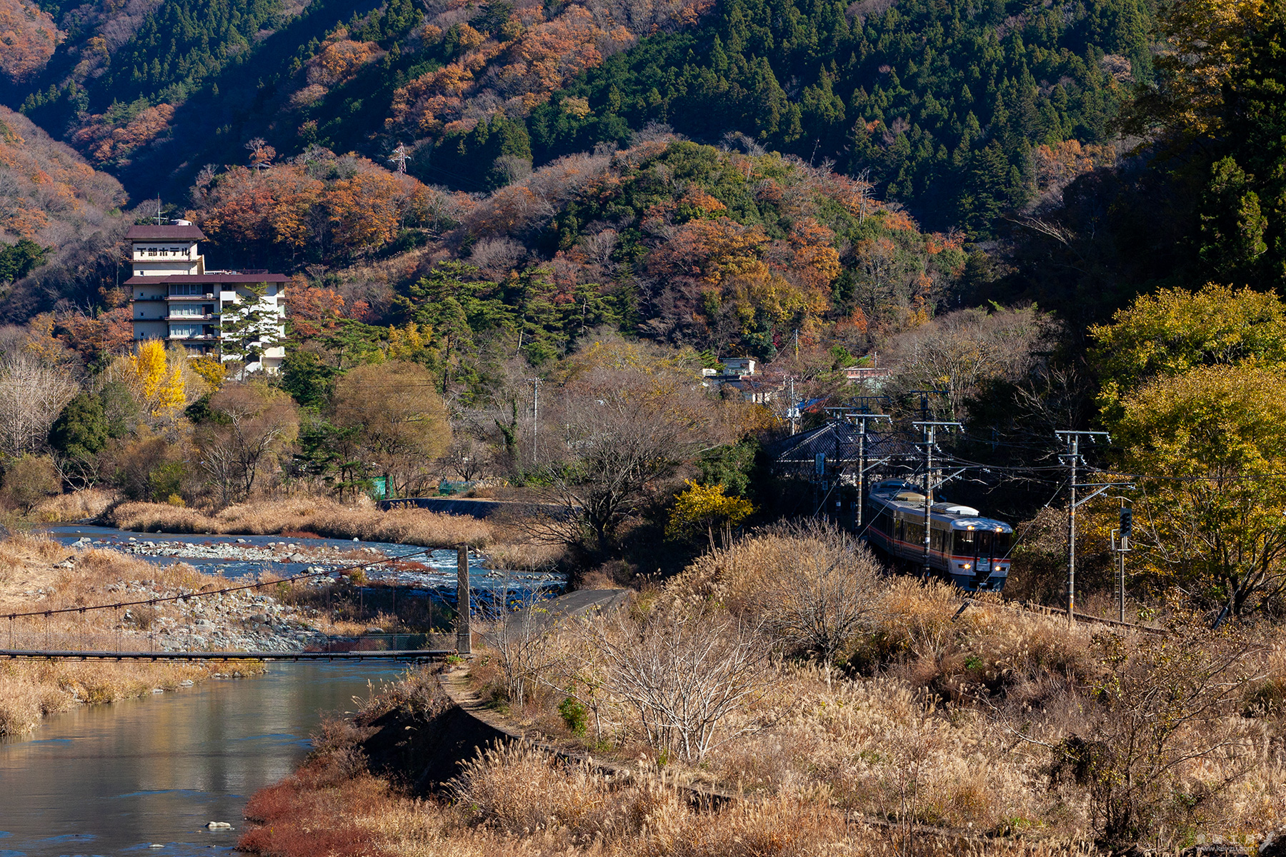 望遠撮影。左奥の建物は下部温泉郷の下部ホテル。