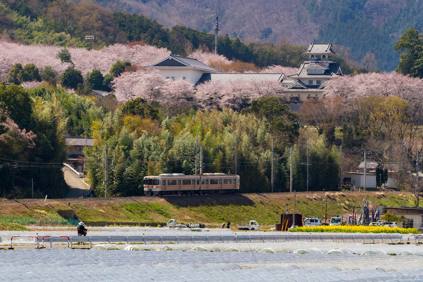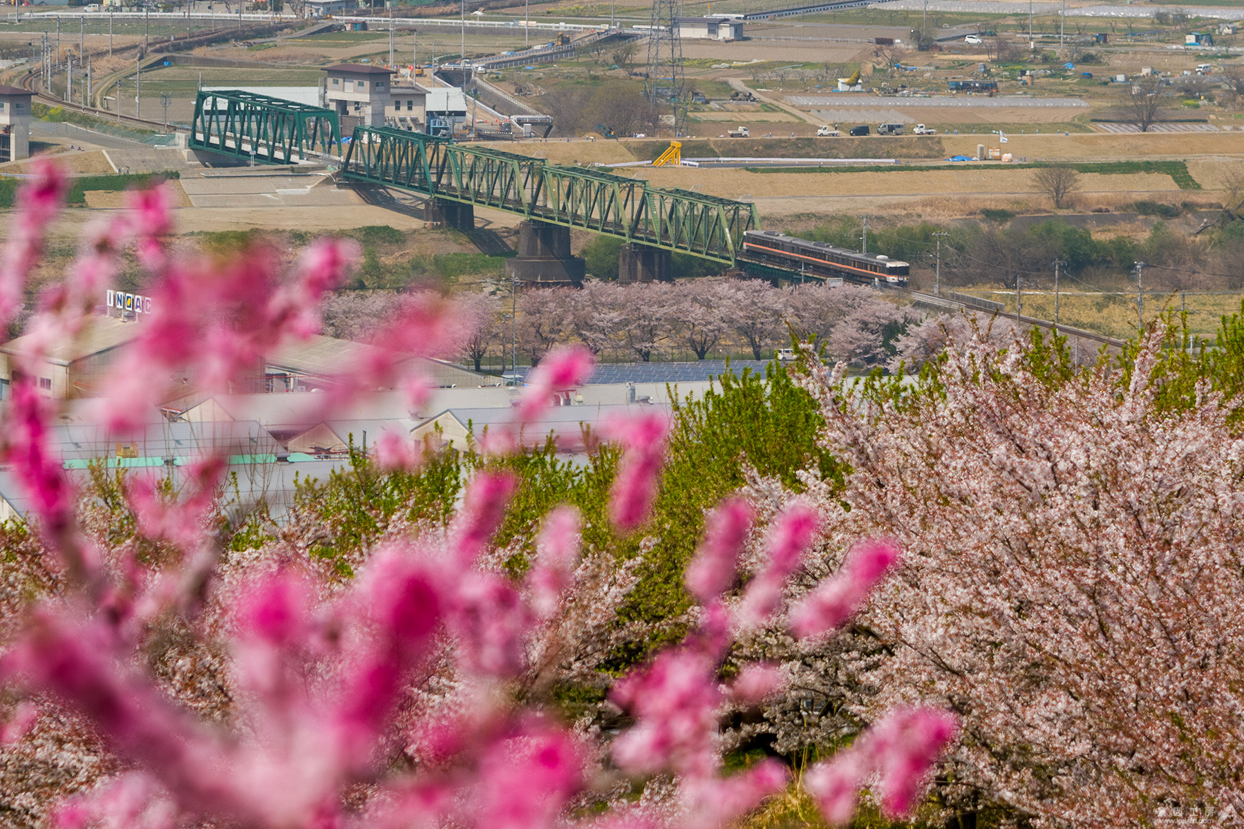 身延線北側の丘陵は桜に加え桃畑が広がっており、花越しに望遠で俯瞰撮影してみた。