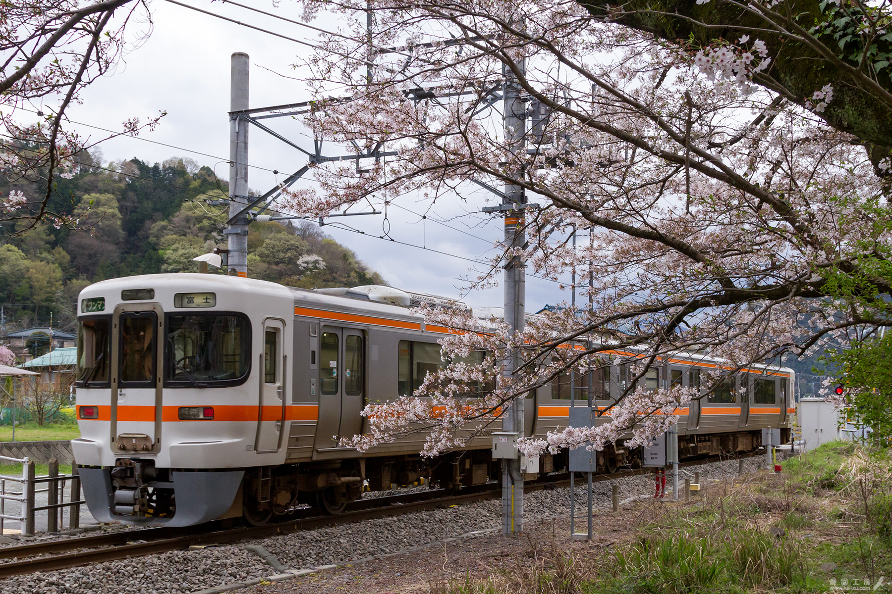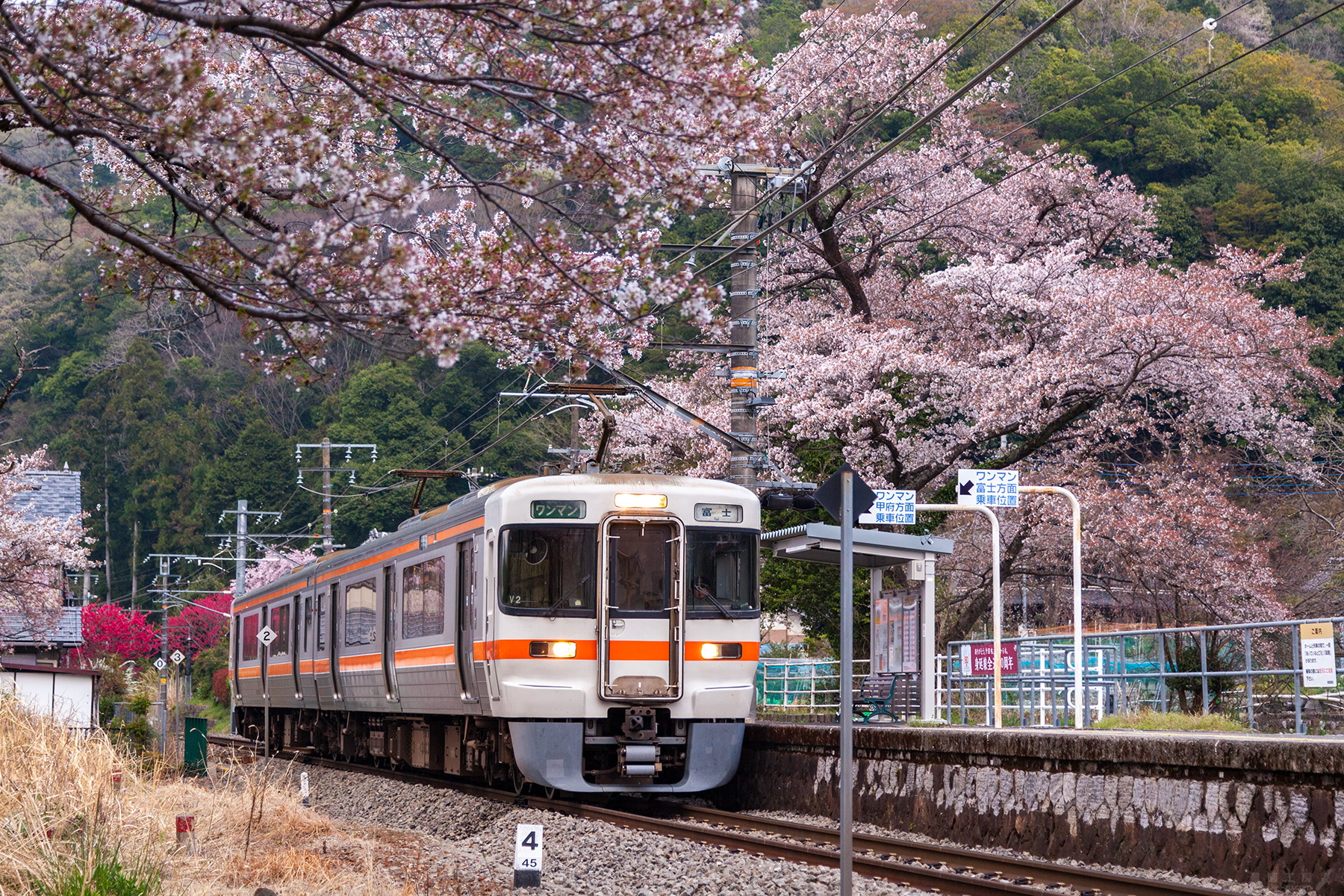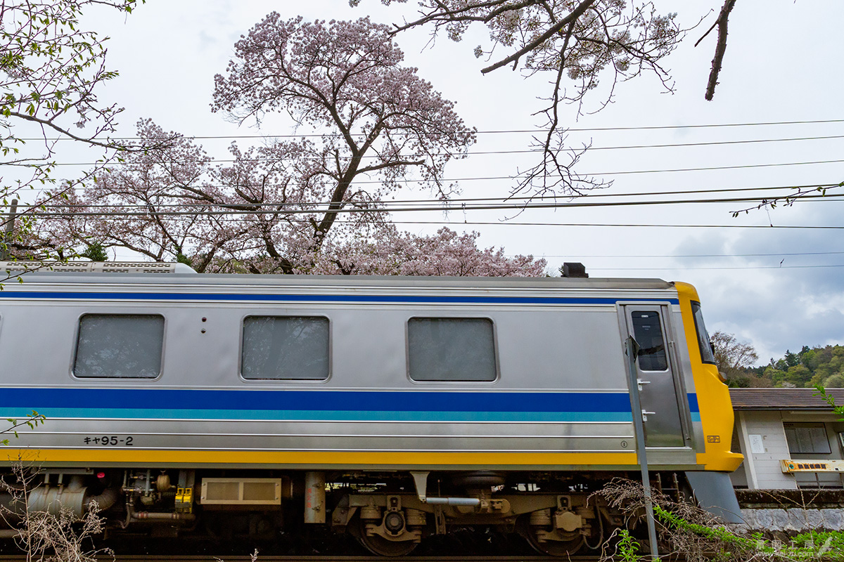 ホームの裏手にある桜の木を正面から撮ろうと三脚をセットしていると、予定時刻ではないのに踏切の警報が鳴り始めた。 特急ふじかわが大幅に遅延したのだろうか?と思っていたところ、やってきたのは検測車であった。