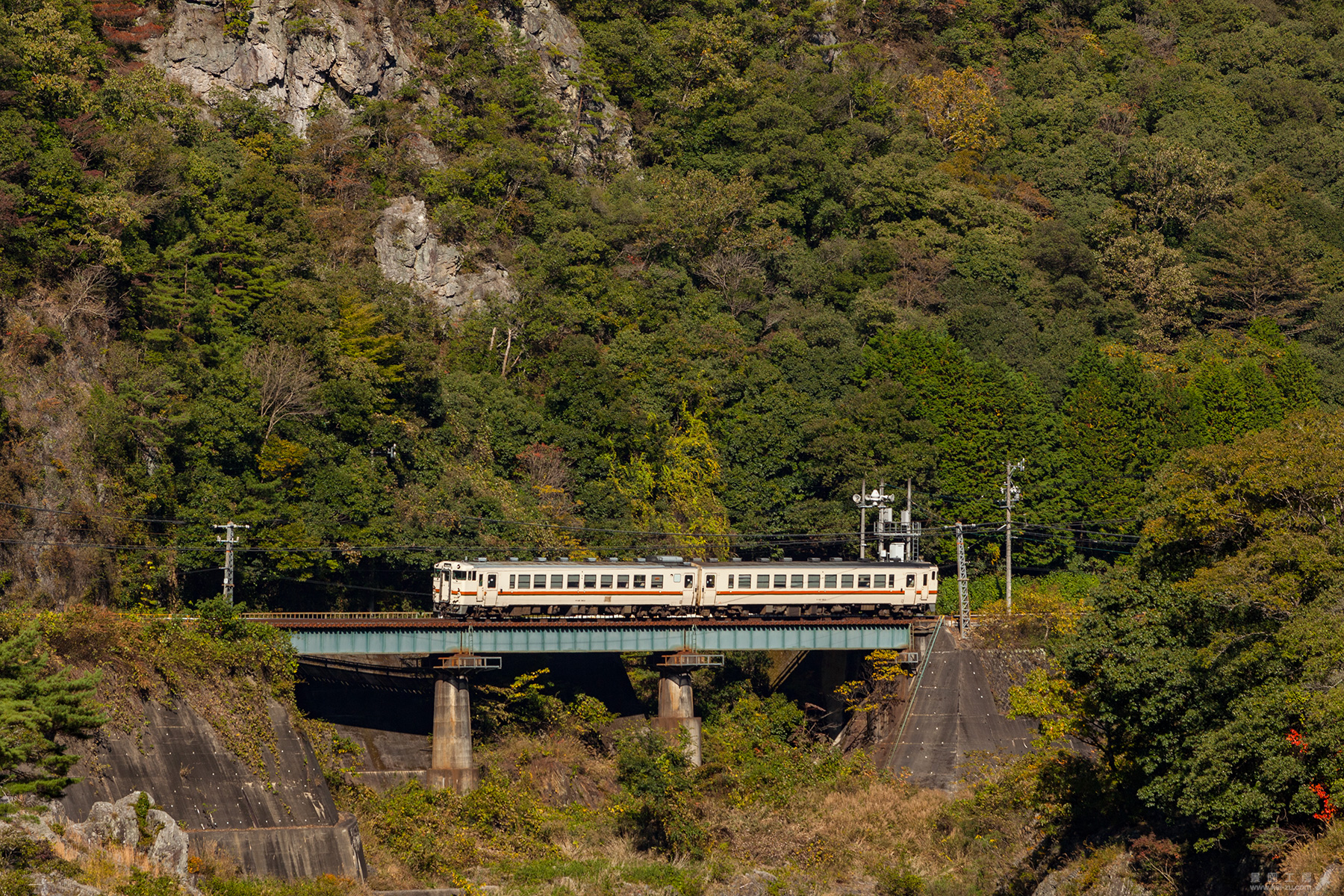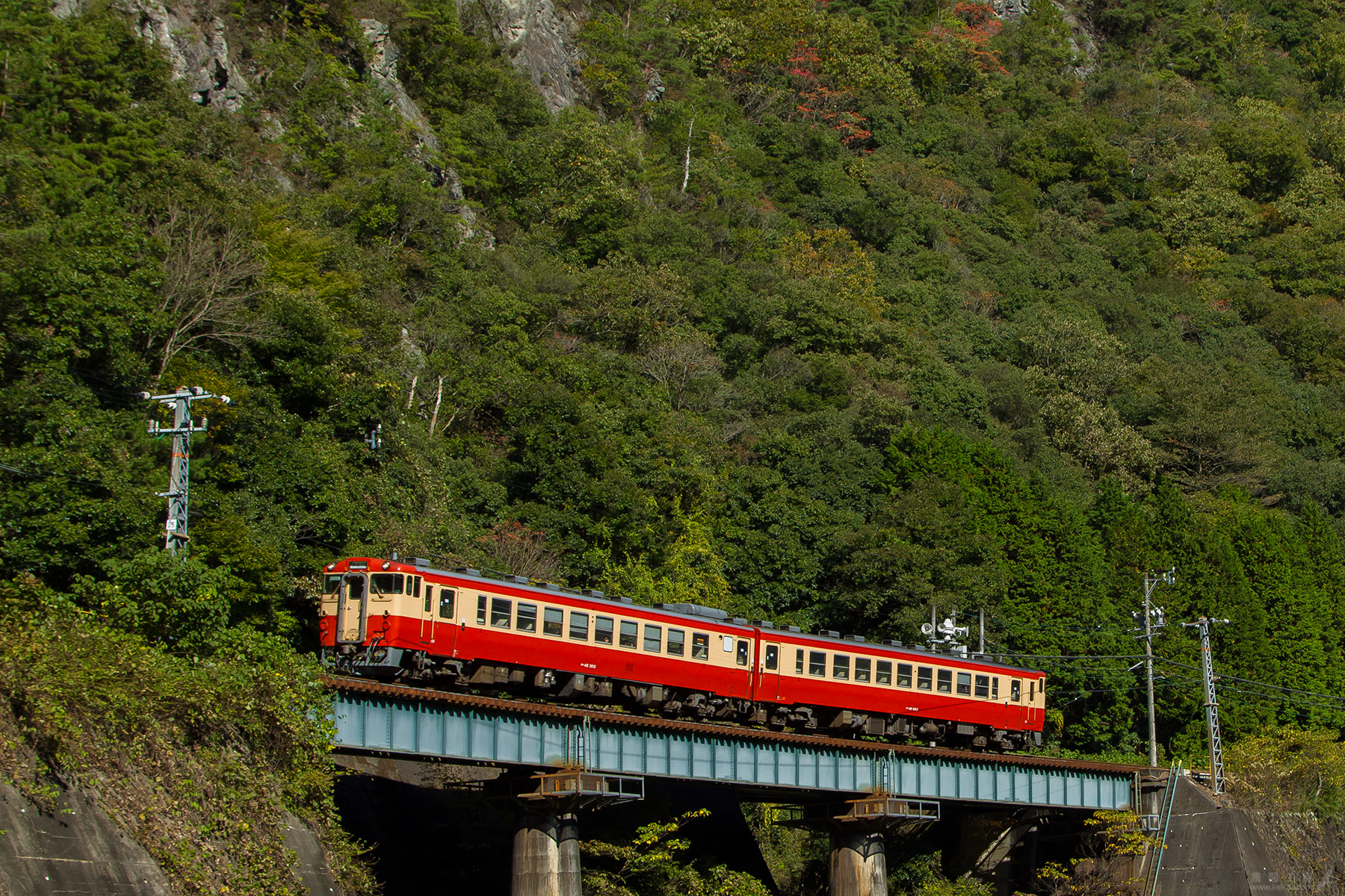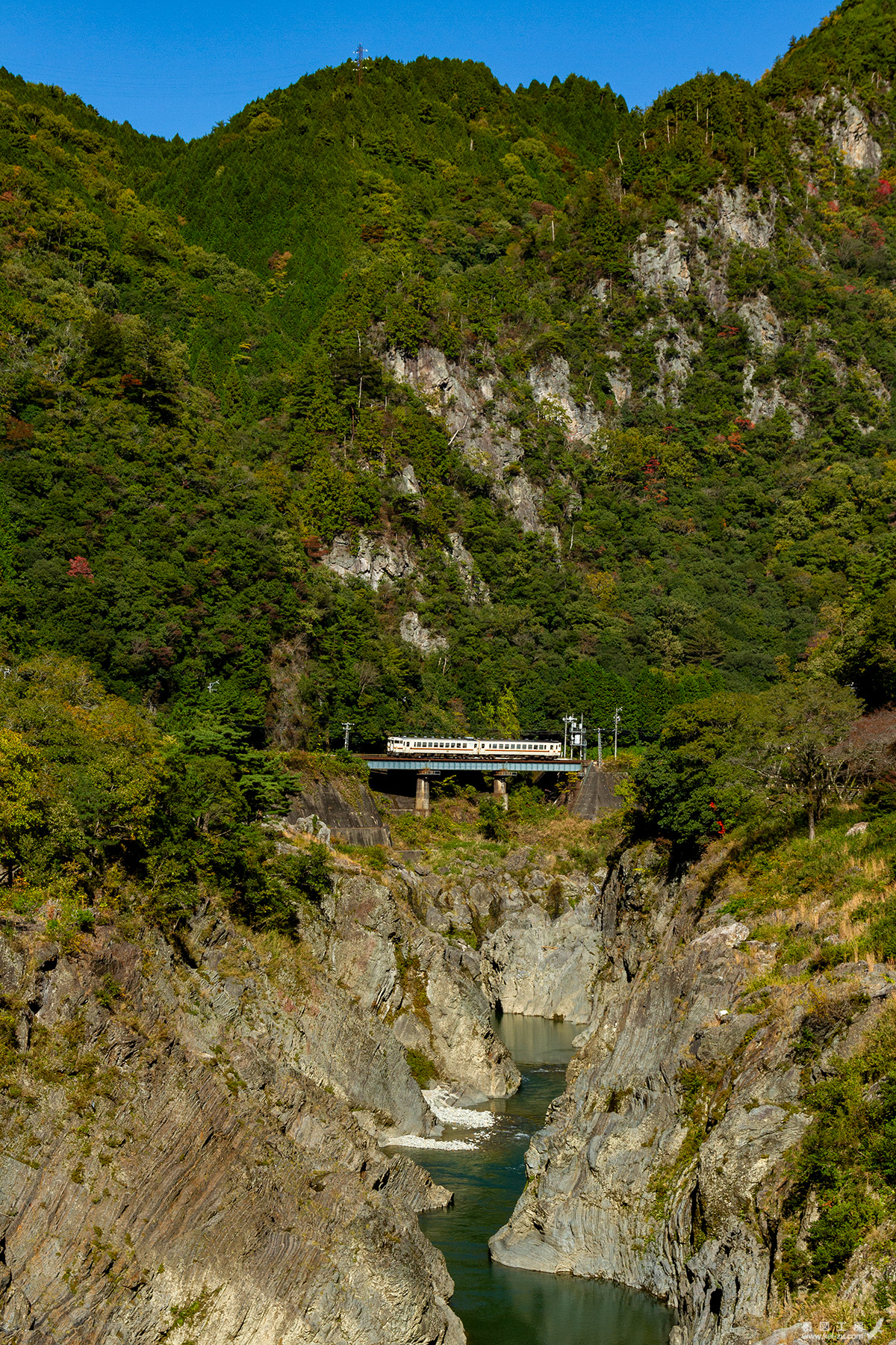 高山本線の上麻生駅付近の飛騨川は飛水峡と呼ばれる景勝地が10kmほど続く。 当撮影地は飛水峡の下流域にある赤池大龍神付近の橋梁を対象としている。 線路脇に繁茂する雑草がないためである。