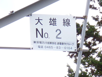 大雄線2号鉄塔は西相模変電所の南の畑地にあり、上から大雄線、南足柄線、明菓足柄線の3系統を併架しています。ともに66kV2回線です。