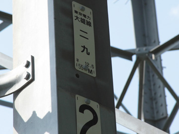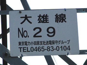 大雄線No.29鉄塔は南足柄市運動公園付近にあり、アサヒビール神奈川線を分岐しており、下段には南足柄線を併架しています。若番側から見て上下段とも回線札が通常とは逆になっているのも特徴といえます。