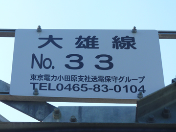 大雄線33号鉄塔は内山発電所の対岸、岩流瀬(がらぜ)土手付近に位置します。この土手(崖)の高さが20mはあるため、河原から見上げると鉄塔の高さは更に高く感じます。内山線を併架し、ここで三菱ガス線が分岐するため、3層になっています。
